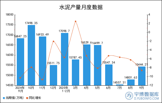 2025年9月全國(guó)水泥產(chǎn)量為15444.21萬噸,累計(jì)值為125935.83萬噸,同比下降8.6%,累計(jì)下降5.2%。