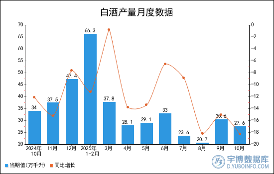 2025年10月全國(guó)白酒(折65度,商品量)產(chǎn)量為27.6萬(wàn)千升,累計(jì)值為290.2萬(wàn)千升,同比下降18.3%,累計(jì)下降11.5%。