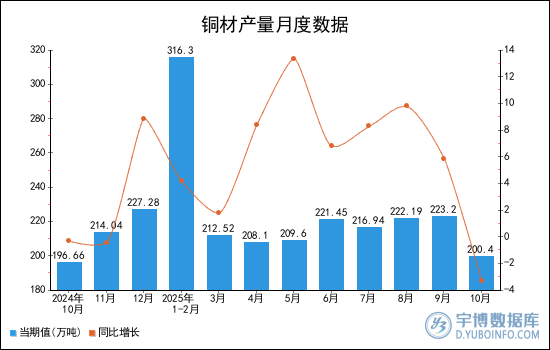 2025年10月全國銅材產(chǎn)量為200.4萬噸,累計值為2012.4萬噸,同比下降3.3%,累計增長5.9%。