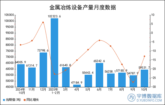 2025年10月全國金屬冶煉設(shè)備產(chǎn)量為59531.7噸,累計(jì)值為567752.3噸,同比下降12.9%,累計(jì)下降15.9%。