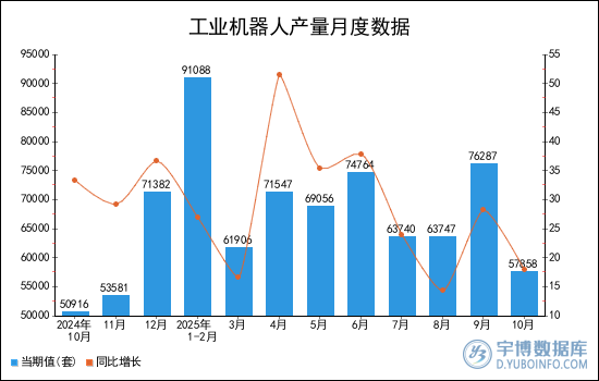 2025年10月全國工業(yè)機(jī)器人產(chǎn)量為57858套,累計(jì)值為602702套,同比增長17.9%,累計(jì)增長28.8%。