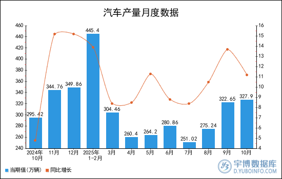 2025年10月全國(guó)汽車產(chǎn)量為327.9萬(wàn)輛,累計(jì)值為2732.5萬(wàn)輛,同比增長(zhǎng)11.2%,累計(jì)增長(zhǎng)11%。