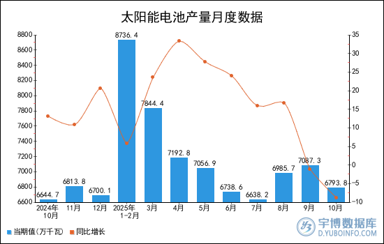 2025年1-10月全國太陽能電池產(chǎn)量分月數(shù)據(jù)
