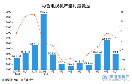2025年10月全國彩色電視機產量為1804萬臺,累計值為16617.6萬臺,同比增長1.7%,累計下降2.3%。