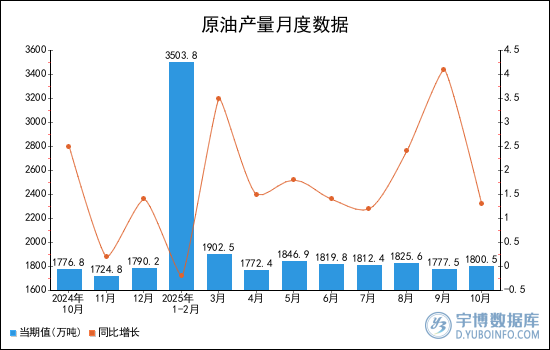 2025年10月全國原油產(chǎn)量為1800.5萬噸,累計值為18063.7萬噸,同比增長1.3%,累計增長1.7%。
