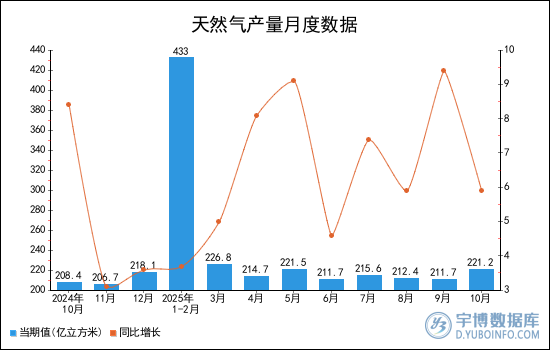 2025年10月全國(guó)天然氣產(chǎn)量為221.2億立方米,累計(jì)值為2170.5億立方米,同比增長(zhǎng)5.9%,累計(jì)增長(zhǎng)6.3%。