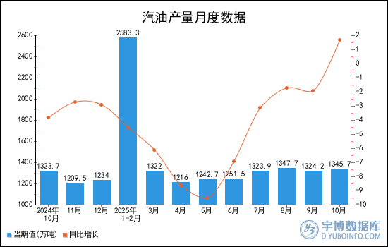 2025年1-10月全國汽油產(chǎn)量分月數(shù)據(jù)