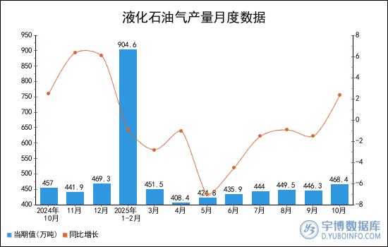2025年10月全國液化石油氣產(chǎn)量為468.4萬噸,累計值為4444.2萬噸,同比增長2.4%,累計下降1.6%。