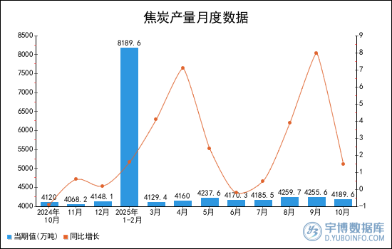 2025年1-02月全國焦炭產(chǎn)量累計值為8189.6萬噸,累計增長1.6%。
