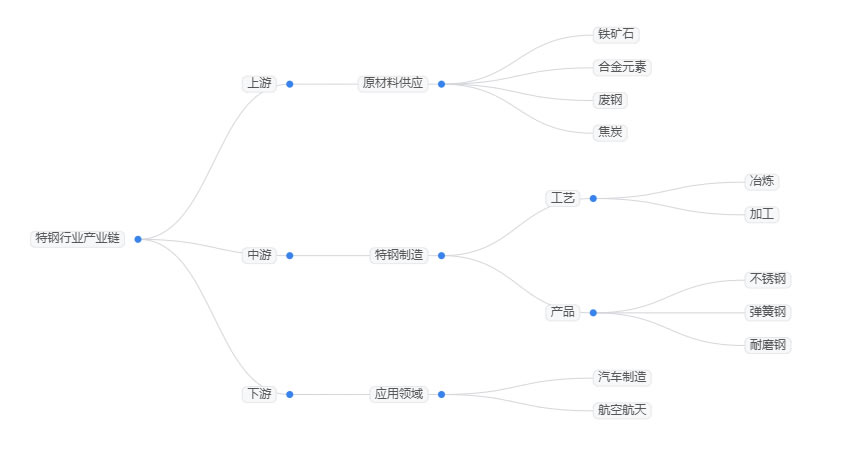 政策通過產(chǎn)能調(diào)控與創(chuàng)新激勵雙重手段,推動特鋼行業(yè)向高端化、低碳化轉(zhuǎn)型,為產(chǎn)業(yè)發(fā)展提供明確政策遵循。線下,特鋼行業(yè)產(chǎn)業(yè)鏈主要包括上游原材料供應、中游特鋼制造以及下游應用領域三個環(huán)節(jié)。上游原材料包括鐵礦石、合金元素、廢鋼、焦炭等,中游經(jīng)冶煉,加工等工藝制造不銹鋼、彈簧鋼、耐磨鋼等特鋼,下游應用領域包括汽車制造,航空航天等領域?,F(xiàn)從三大方面來分析2025年特鋼行業(yè)政策。