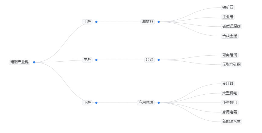 硅鋼行業(yè)需求結(jié)構(gòu)呈現(xiàn) “傳統(tǒng)領(lǐng)域穩(wěn)增、新興領(lǐng)域爆發(fā)” 的特征,區(qū)域消費(fèi)格局與下游產(chǎn)業(yè)布局高度相關(guān)。技術(shù)升級與綠色轉(zhuǎn)型成為硅鋼行業(yè)高質(zhì)量發(fā)展的核心驅(qū)動力,工藝創(chuàng)新與政策引導(dǎo)共同推動產(chǎn)業(yè)升級。硅鋼產(chǎn)業(yè)鏈上游為原材料,包括鐵礦石、工業(yè)硅、碳質(zhì)還原劑、合成金屬等;中游為硅鋼,可分為取向硅鋼和無取向硅鋼;下游應(yīng)用于變壓器、大型機(jī)電、小型機(jī)電、家用電器、新能源汽車等領(lǐng)域。