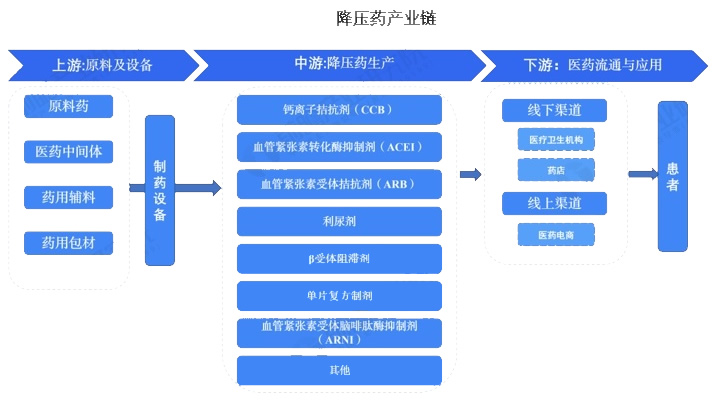 降壓藥產(chǎn)業(yè)鏈可劃分為三個環(huán)節(jié),上游為原料藥、醫(yī)藥中間體、藥用輔料、藥用包材及制藥設(shè)備等原料及設(shè)備供應(yīng);中游包括鈣離子拮抗劑(CCB)、血管緊張素轉(zhuǎn)化酶抑制劑(ACEI)、血管緊張素受體拮抗劑(ARB)、利尿劑、β受體阻滯劑、單片復(fù)方制劑及血管緊張素受體腦啡肽酶抑制劑(ARNI)等不同種類降壓藥的生產(chǎn);下游為醫(yī)藥流通和降壓藥的應(yīng)用。