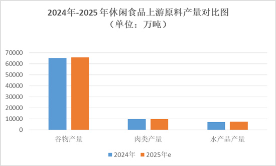 休閑食品產(chǎn)業(yè)鏈涵蓋上游原料供應(yīng)、中游生產(chǎn)制造、下游銷售渠道三大環(huán)節(jié),各環(huán)節(jié)協(xié)同發(fā)展推動行業(yè)升級。上游主要包括食品原料、食品輔料、食品添加劑、食品包裝材料等,其中食品原料包括堅(jiān)果、果蔬、五谷、肉類、水產(chǎn)品等,2024 年中國谷物產(chǎn)量 65229 萬噸,肉類產(chǎn)量 9779.93 萬噸,水產(chǎn)品產(chǎn)量 7366.5 萬噸,預(yù)計(jì) 2025 年將分別增長至 65920 萬噸、10000 萬噸以上、7535 萬噸,為休閑食品生產(chǎn)提供了充足的原料保障。上游重點(diǎn)企業(yè)通過規(guī)?;?biāo)準(zhǔn)化、綠色化轉(zhuǎn)型,強(qiáng)化資源控制力和技術(shù)創(chuàng)新能力,為休閑食品行業(yè)提供高質(zhì)量原料支撐。