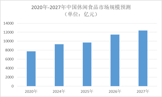 中國報(bào)告大廳《2025-2030年中國休閑食品行業(yè)競爭格局及投資規(guī)劃深度研究分析報(bào)告》指出,中國休閑食品行業(yè)市場規(guī)模從 2020 年的 7749 億元增長至 2024 年的 9330 億元,復(fù)合年增長率為 4.8%,2025 年預(yù)計(jì)將達(dá)到 9720 億元,預(yù)計(jì)到 2027 年行業(yè)規(guī)模將進(jìn)一步攀升至 12378 億元,長期增長潛力顯著。驅(qū)動休閑食品行業(yè)增長的核心因素包括居民可支配收入增長、城鎮(zhèn)化進(jìn)程持續(xù)推進(jìn)、消費(fèi)場景日益豐富、現(xiàn)有產(chǎn)品持續(xù)升級及新產(chǎn)品推出、銷售渠道不斷改善等,為休閑食品行業(yè)的持續(xù)擴(kuò)容奠定了堅(jiān)實(shí)基礎(chǔ)。