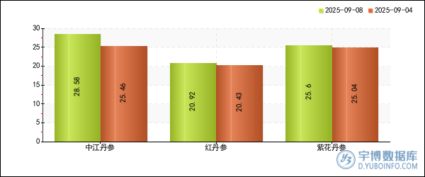 宇博智業(yè)監(jiān)測數(shù)據(jù)顯示,2025年09月08日,全國6類丹參中,均價上漲的品種有3個,