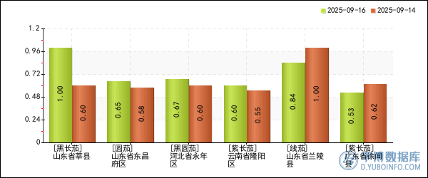 其中,山東省莘縣的黑長(zhǎng)茄價(jià)格漲幅最大,漲幅為66.67%,報(bào)1.00元/斤(2025年09月14日價(jià)格報(bào)0.60元/斤)。山東省蘭陵縣的線(xiàn)茄的價(jià)格下跌幅度最大,跌幅為16%,報(bào)0.84元/斤(2025年09月14日價(jià)格報(bào)1.00元/斤)。