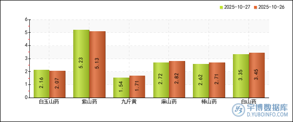 宇博智業(yè)監(jiān)測數(shù)據(jù)顯示,2025年10月27日,全國99類山藥中,均價上漲的品種有2個,均價下跌的品種有6個。
