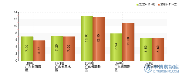 其中,廣東省南海區(qū)的白鴨價格漲幅最大,漲幅為19.05%,報7.00元/斤(2025年11月02日價格報5.88元/斤)。廣東省清新區(qū)的麻鴨的價格下跌幅度最大,跌幅為27.82%,報7.94元/斤(2025年11月02日價格報11.00元/斤)。