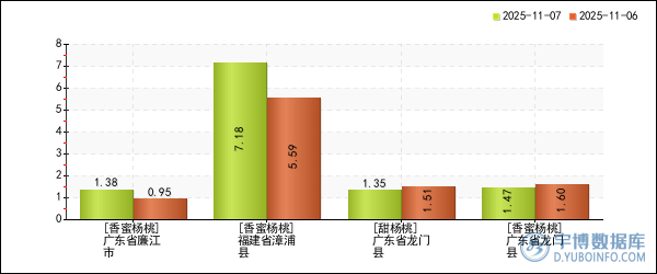 宇博智業(yè)監(jiān)測數(shù)據(jù)顯示,2025年11月07日廣東省廉江市地區(qū)的香蜜楊桃價格漲幅最大,漲幅為45.26%,報1.38元/斤(2025年11月06日價格報0.95元/斤)。廣東省龍門縣地區(qū)的甜楊桃價格跌幅最大,跌幅為10.6%,報1.35元/斤(2025年11月06日價格報1.51元/斤)。