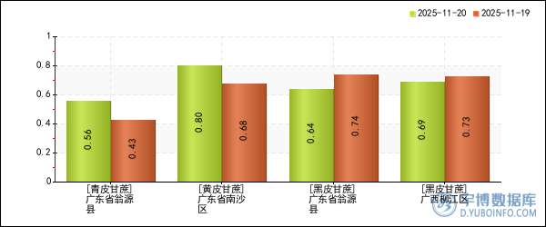 宇博智業(yè)監(jiān)測數(shù)據(jù)顯示,2025年11月20日廣東省翁源縣地區(qū)的青皮甘蔗價格漲幅最大,漲幅為30.23%,報0.56元/斤(2025年11月19日價格報0.43元/斤)。廣東省翁源縣地區(qū)的黑皮甘蔗價格跌幅最大,跌幅為13.51%,報0.64元/斤(2025年11月19日價格報0.74元/斤)。