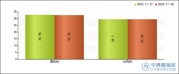 宇博智業(yè)監(jiān)測數(shù)據(jù)顯示,2025年11月21日,全國35類枸杞中,均價上漲的品種有2個,