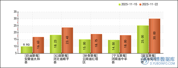 2025年11月21日,宇博智業(yè)大數(shù)據(jù)預警中心數(shù)據(jù)顯示,草莓產品重點產地中,共有7家產地的多個品種價格較8周前(2025年09月26日)出現(xiàn)了上漲,平均上漲幅度為27.54%。其中,安徽省太和縣的奶油草莓、河北省順平縣的紅顏草莓價格上漲幅度較大,今日報價分別為16.63元/斤、23.43元/斤,較8周前(2025年09月26日)分別上漲了67.98%、28.52%,值得投資者重點關注。