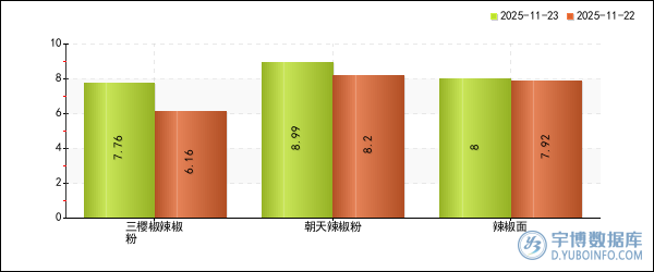 宇博智業(yè)監(jiān)測數(shù)據(jù)顯示,2025年11月23日貴州省紅花崗區(qū)地區(qū)的辣椒面價(jià)格漲幅最大,漲幅為12.75%,報(bào)9.46元/斤(2025年11月22日價(jià)格報(bào)8.39元/斤)。河南省柘城縣地區(qū)的三櫻椒辣椒粉價(jià)格跌幅最大,跌幅為1.02%,報(bào)7.74元/斤(2025年11月22日價(jià)格報(bào)7.82元/斤)。