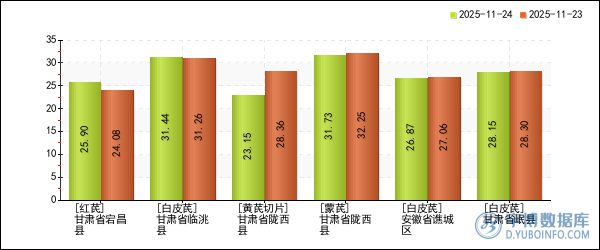 云南省官渡區(qū)地區(qū)的紅芪今日價格最高,報41.5元/斤,較前一報價日(2025年11月23日價格報41.5元/斤)持平。甘肅省西和縣地區(qū)白皮芪今日價格最低,報12元/斤,較前一報價日(2025年11月23日價格報12元/斤)持平。