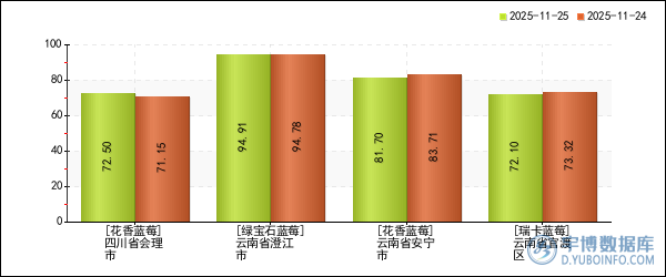 其中,四川省會理市的花香藍莓價格漲幅最大,漲幅為1.9%,報72.50元/斤(2025年11月24日價格報71.15元/斤)。云南省安寧市的花香藍莓的價格下跌幅度最大,跌幅為2.4%,報81.70元/斤(2025年11月24日價格報83.71元/斤)。