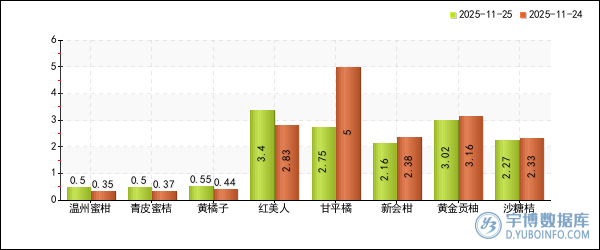| 蜜桔 | 1.03元/斤 | 1.2元/斤 | -14.17% | |