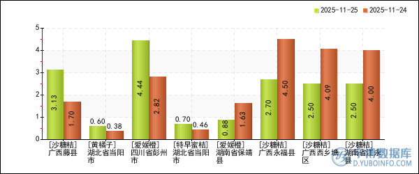 其中,廣西藤縣的沙糖桔價格漲幅最大,漲幅為84.12%,報3.13元/斤(2025年11月24日價格報1.70元/斤)。湖南省保靖縣的愛媛橙的價格下跌幅度最大,跌幅為46.01%,報0.88元/斤(2025年11月24日價格報1.63元/斤)。