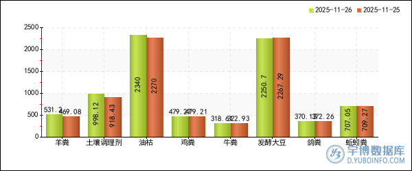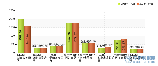 宇博智業(yè)監(jiān)測數(shù)據(jù)顯示,2025年11月26日湖南省芙蓉區(qū)地區(qū)的羊糞價格漲幅最大,漲幅為26.16%,報2028元/噸(2025年11月25日價格報1607.5元/噸)。河北省靈壽縣地區(qū)的微生物有機肥價格跌幅最大,跌幅為7.16%,報562.86元/噸(2025年11月25日價格報606.25元/噸)。