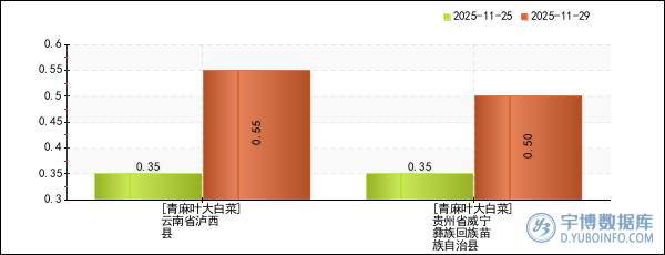 2025年11月28日,宇博智業(yè)大數(shù)據(jù)預(yù)警中心數(shù)據(jù)顯示,白菜產(chǎn)品重點(diǎn)產(chǎn)地中,共有2家產(chǎn)地的多個(gè)品種價(jià)格較8周前(2025年10月03日)出現(xiàn)了上漲,平均上漲幅度為50%。其中,云南省瀘西縣的青麻葉大白菜、貴州省威寧彝族回族苗族自治縣的青麻葉大白菜價(jià)格上漲幅度較大,今日?qǐng)?bào)價(jià)分別為0.55元/斤、0.50元/斤,較8周前(2025年10月03日)分別上漲了57.14%、42.86%,值得投資者重點(diǎn)關(guān)注。
