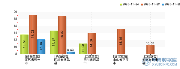 2025年11月28日,宇博智業(yè)大數(shù)據(jù)預(yù)警中心數(shù)據(jù)顯示,草莓產(chǎn)品重點產(chǎn)地中,共有7家產(chǎn)地的多個品種價格較4周前(2025年10月31日)出現(xiàn)了上漲,平均上漲幅度為26.28%。其中,江蘇省邳州市的妙香草莓、四川省德昌縣的奶油草莓價格上漲幅度較大,今日報價分別為19.22元/斤、18.82元/斤,較4周前(2025年10月31日)分別上漲了42.05%、28.29%,值得投資者重點關(guān)注。