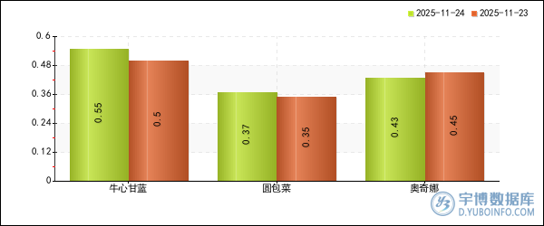 宇博智業(yè)監(jiān)測數(shù)據(jù)顯示,2025年11月24日河南省博愛縣地區(qū)的圓包菜價格漲幅最大,漲幅為143.48%,報0.56元/斤(2025年11月23日價格報0.23元/斤)。湖北省長陽土家族自治縣地區(qū)的平包菜價格跌幅最大,跌幅為5.71%,報0.33元/斤(2025年11月23日價格報0.35元/斤)。