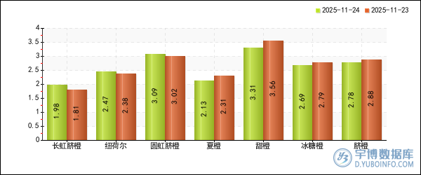 宇博智業(yè)監(jiān)測數(shù)據(jù)顯示,2025年11月24日,全國140類橙子中,均價(jià)上漲的品種有3個,均價(jià)下跌的品種有5個。