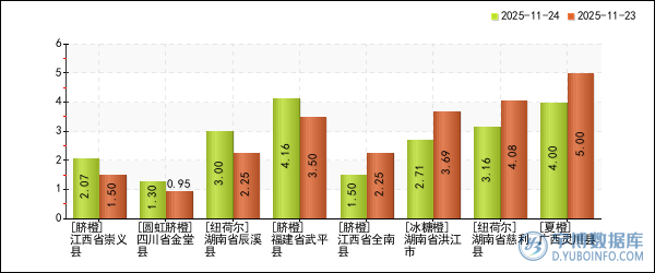 宇博智業(yè)監(jiān)測數(shù)據(jù)顯示,2025年11月24日江西省崇義縣地區(qū)的臍橙價(jià)格漲幅最大,漲幅為38%,報(bào)2.07元/斤(2025年11月23日價(jià)格報(bào)1.5元/斤)。江西省全南縣地區(qū)的臍橙價(jià)格跌幅最大,跌幅為33.33%,報(bào)1.5元/斤(2025年11月23日價(jià)格報(bào)2.25元/斤)。