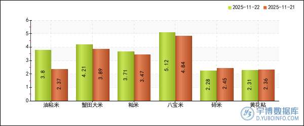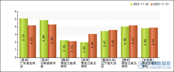宇博智業(yè)監(jiān)測(cè)數(shù)據(jù)顯示,2025年11月22日廣東省龍崗區(qū)地區(qū)的香米價(jià)格漲幅最大,漲幅為20.57%,報(bào)5.1元/斤(2025年11月21日價(jià)格報(bào)4.23元/斤)。黑龍江省五常市地區(qū)的碎米價(jià)格跌幅最大,跌幅為35.28%,報(bào)2元/斤(2025年11月21日價(jià)格報(bào)3.09元/斤)。