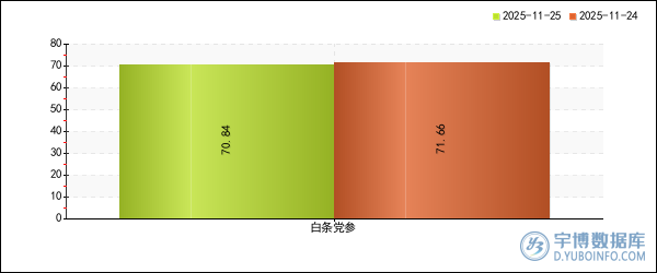 宇博智業(yè)監(jiān)測數(shù)據(jù)顯示,2025年11月25日,全國28類黨參中,僅有白條黨參的價(jià)格出現(xiàn)了下跌,跌幅為1.13%,當(dāng)日報(bào)價(jià)為70.84元/斤。