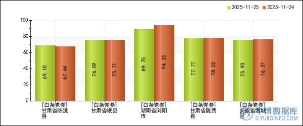 其中,甘肅省臨洮縣的白條黨參價(jià)格漲幅最大,漲幅為2.16%,報(bào)69.10元/斤(2025年11月24日價(jià)格報(bào)67.64元/斤)。湖南省瀏陽市的白條黨參的價(jià)格下跌幅度最大,跌幅為4.86%,報(bào)89.75元/斤(2025年11月24日價(jià)格報(bào)94.33元/斤)。