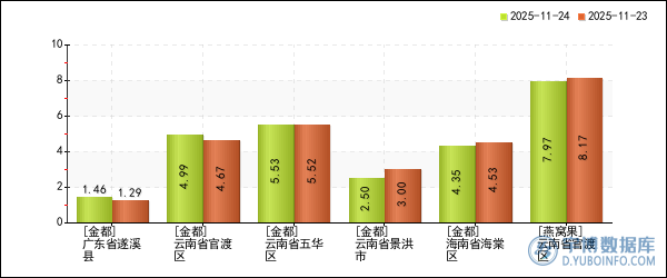 其中,廣東省遂溪縣的金都價(jià)格漲幅最大,漲幅為13.18%,報(bào)1.46元/斤(2025年11月23日價(jià)格報(bào)1.29元/斤)。云南省景洪市的金都的價(jià)格下跌幅度最大,跌幅為16.67%,報(bào)2.50元/斤(2025年11月23日價(jià)格報(bào)3.00元/斤)。
