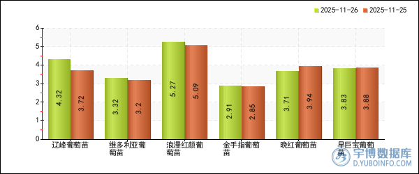 宇博智業(yè)監(jiān)測數(shù)據(jù)顯示,2025年11月26日,全國168類葡萄苗中,均價(jià)上漲的品種有12個(gè),均價(jià)下跌的品種有2個(gè)。