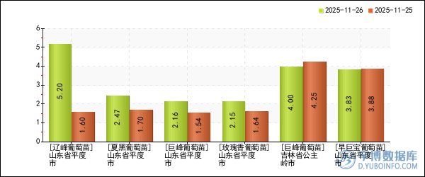 宇博智業(yè)監(jiān)測數(shù)據(jù)顯示,2025年11月26日山東省平度市地區(qū)的遼峰葡萄苗價(jià)格漲幅最大,漲幅為225%,報(bào)5.2元/株(2025年11月25日價(jià)格報(bào)1.6元/株)。吉林省公主嶺市地區(qū)的巨峰葡萄苗價(jià)格跌幅最大,跌幅為5.88%,報(bào)4元/株(2025年11月25日價(jià)格報(bào)4.25元/株)。