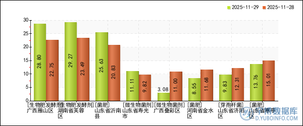 其中,廣西雁山區(qū)的生物肥發(fā)酵劑價格漲幅最大,漲幅為26.59%,報28.80元/斤(2025年11月28日價格報22.75元/斤)。廣西疊彩區(qū)的微生物菌劑的價格下跌幅度最大,跌幅為72%,報3.08元/斤(2025年11月28日價格報11.00元/斤)。