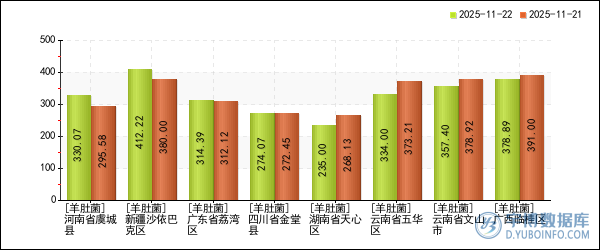 宇博智業(yè)監(jiān)測(cè)數(shù)據(jù)顯示,2025年11月22日河南省虞城縣地區(qū)的羊肚菌價(jià)格漲幅最大,漲幅為11.67%,報(bào)330.07元/斤(2025年11月21日價(jià)格報(bào)295.58元/斤)。湖南省天心區(qū)地區(qū)的羊肚菌價(jià)格跌幅最大,跌幅為12.36%,報(bào)235元/斤(2025年11月21日價(jià)格報(bào)268.13元/斤)。