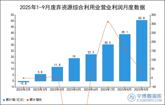 2025年1-9月廢棄資源綜合利用業(yè)營(yíng)業(yè)利潤(rùn)累計(jì)值為50.8億元,累計(jì)增長(zhǎng)36.2%。