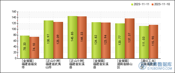 宇博智業(yè)監(jiān)測(cè)數(shù)據(jù)顯示,2025年11月11日福建省福安市地區(qū)的金駿眉價(jià)格漲幅最大,漲幅為5.71%,報(bào)78.33元/斤(2025年11月10日價(jià)格報(bào)74.1元/斤)。湖南省赫山區(qū)地區(qū)的金駿眉價(jià)格跌幅最大,跌幅為12.08%,報(bào)120.77元/斤(2025年11月10日價(jià)格報(bào)137.37元/斤)。