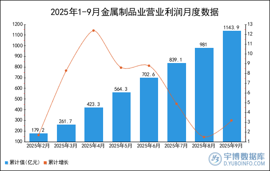 2025年1-9月金屬制品業(yè)營(yíng)業(yè)利潤(rùn)累計(jì)值為1143.9億元,累計(jì)增長(zhǎng)3.2%。