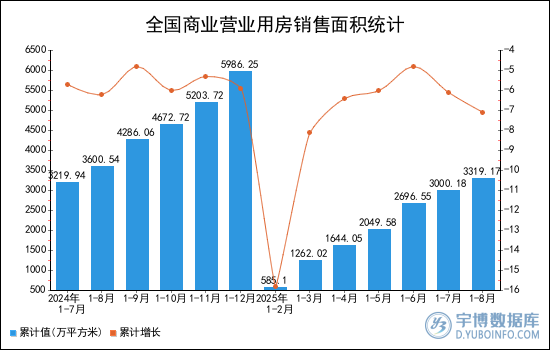 2025年1-8月全國商業(yè)營業(yè)用房銷售面積(累計值)為3319.17萬平方米,累計下降7.1%。