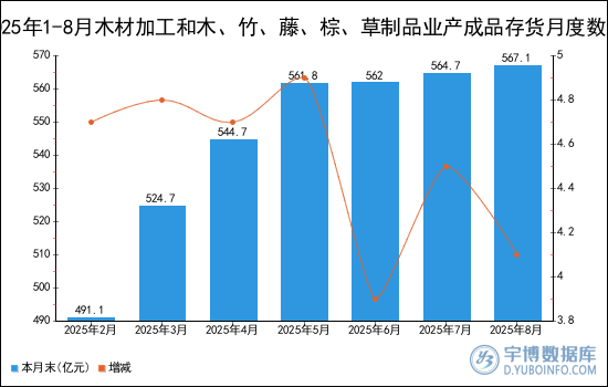 2025年8月木材加工和木、竹、藤、棕、草制品業(yè)產(chǎn)成品存貨本月末為567.1億元,增減4.1%。